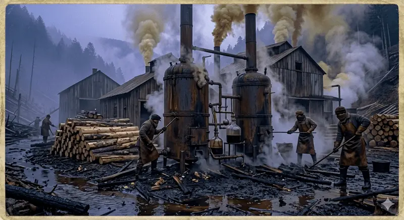 As the tannins were extracted, a new, chemically intensive industry emerged to process the remaining, discarded hardwood: "Acid Factories" or "Chemical Plants." These remote industrial complexes Specialized in a process called destructive distillation. Millions of tons of beech, birch, maple, and sometimes the leftover ghost hemlock wood were loaded into air-tight "retorts" and slow-cooked, not to burn the wood, but to capture the gases and liquids.