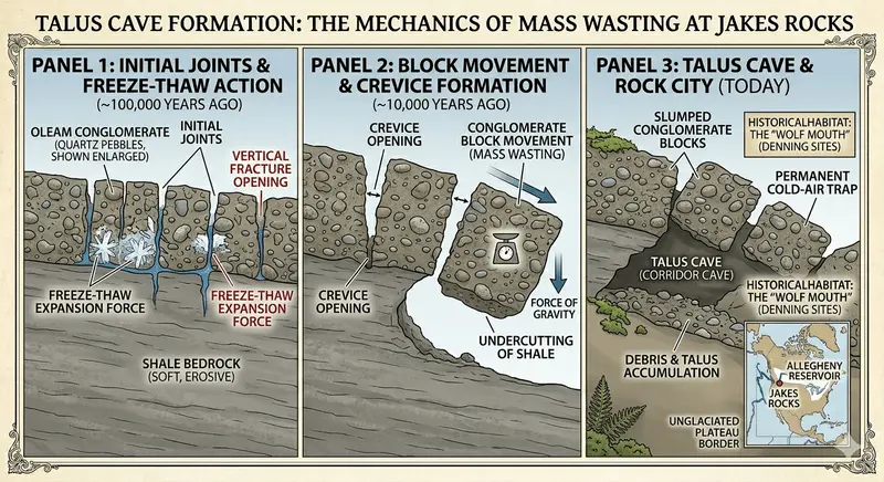 Over millions of years, water seeps into the vertical joints (cracks) of the conglomerate. When that water freezes, it expands with enough force to nudge multi-ton blocks away from the main cliff face. This process, known as Mass Wasting, creates deep, narrow "corridor caves." These aren't limestone caverns carved by acid; they are mechanical "unzippings" of the earth’s crust.